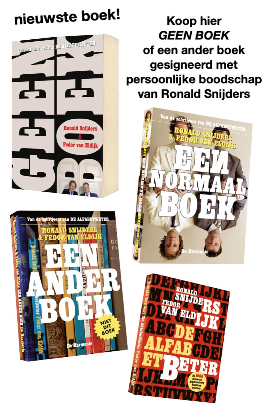 Leuk nieuws: volgende week verschijnt Geen boek. Eindelijk een goed cadeau voor mensen die liever geen boek willen. Na Een normaal boek (2006) en Een ander boek (2012) vonden Ronald Snijders & Fedor van Eldijk het tijd om eens een keer geen boek te schrijven. Geen boek bevat de beste teksten uit 10 jaar Schrikkelkalender: hele gewone korte verhalen, normale dialogen, tijdloze nieuwsberichten, slechte slogans, ontsporende app-conversaties en hapklare oplossingen tegen jazz.